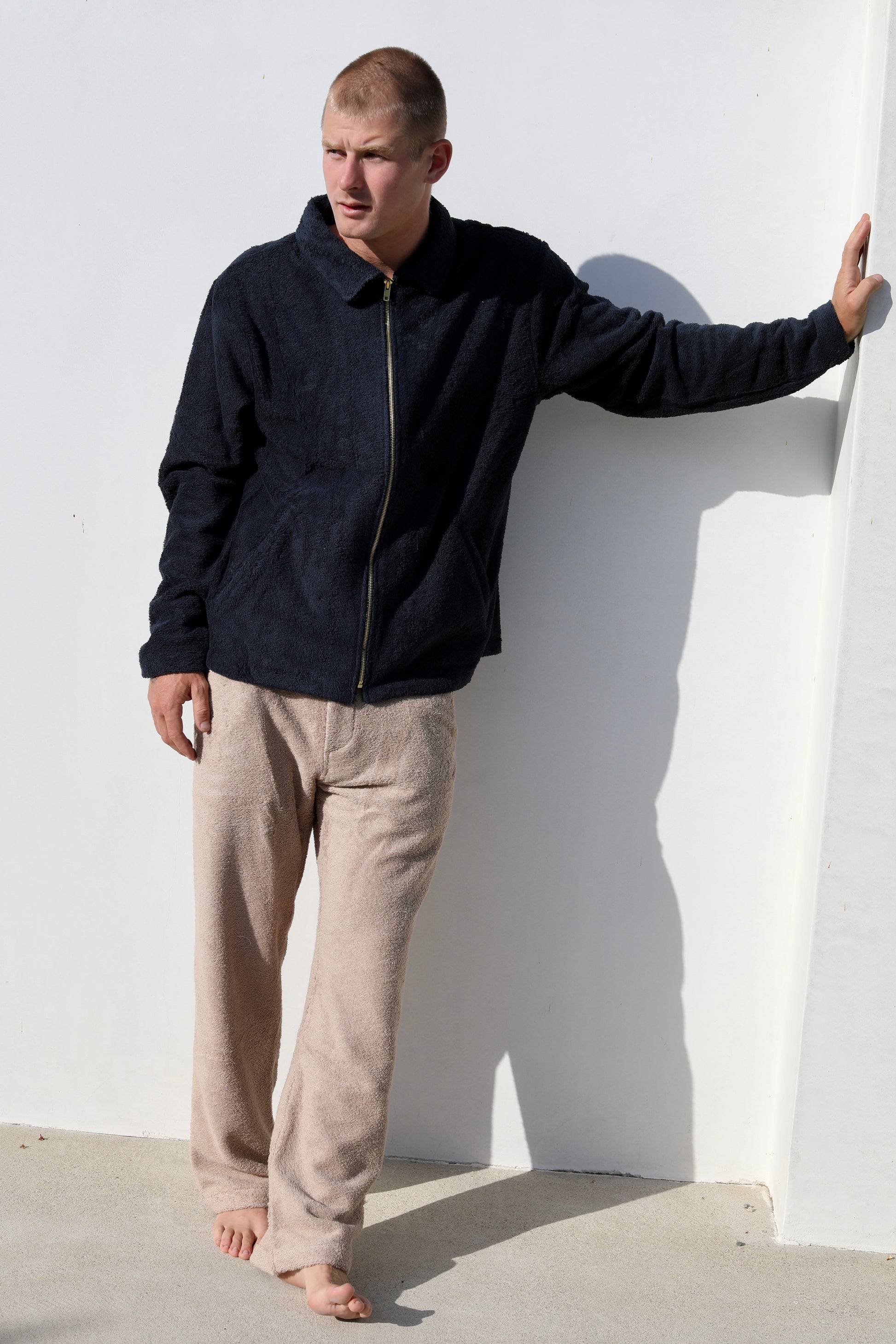 UNISEX Loose Fit Terry Pant, zipper and button closure, Belt loops, 2 side pockets and 2 large back pockets. Sits low on hip.