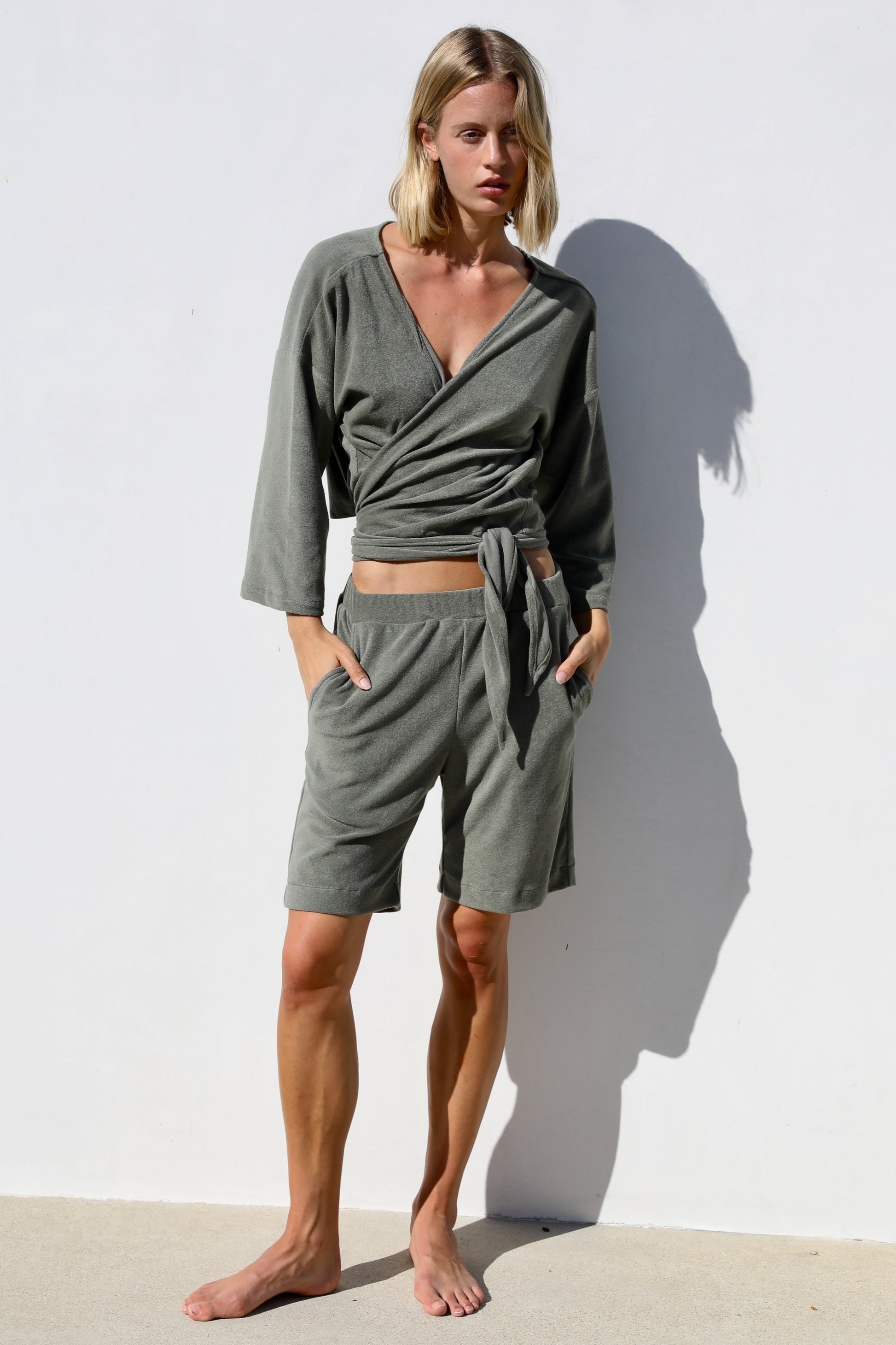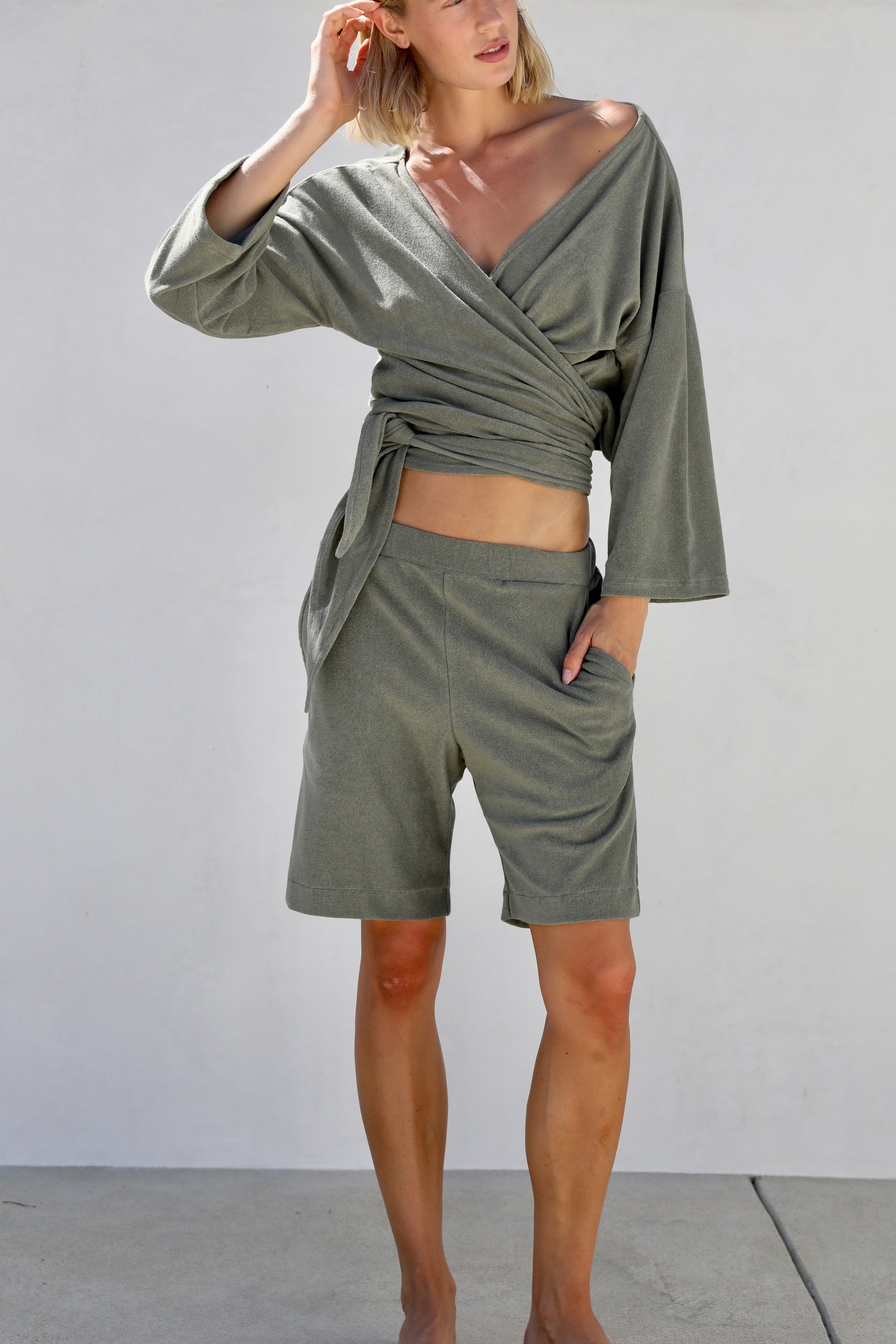 Pull on terry shorts. Comfortable elasticized waist, sits low waist. Two side pockets. Above knee length.