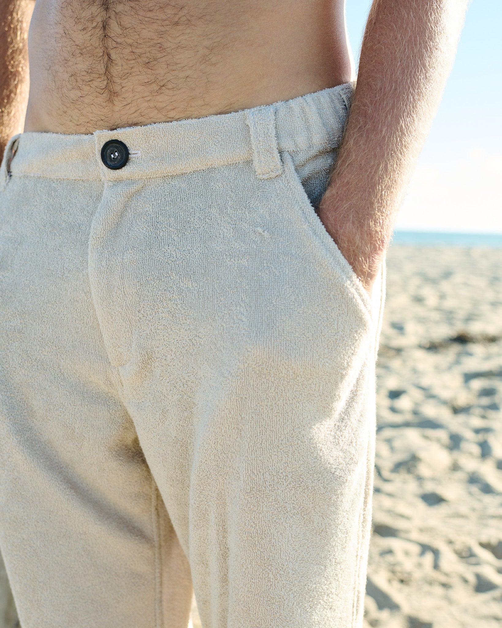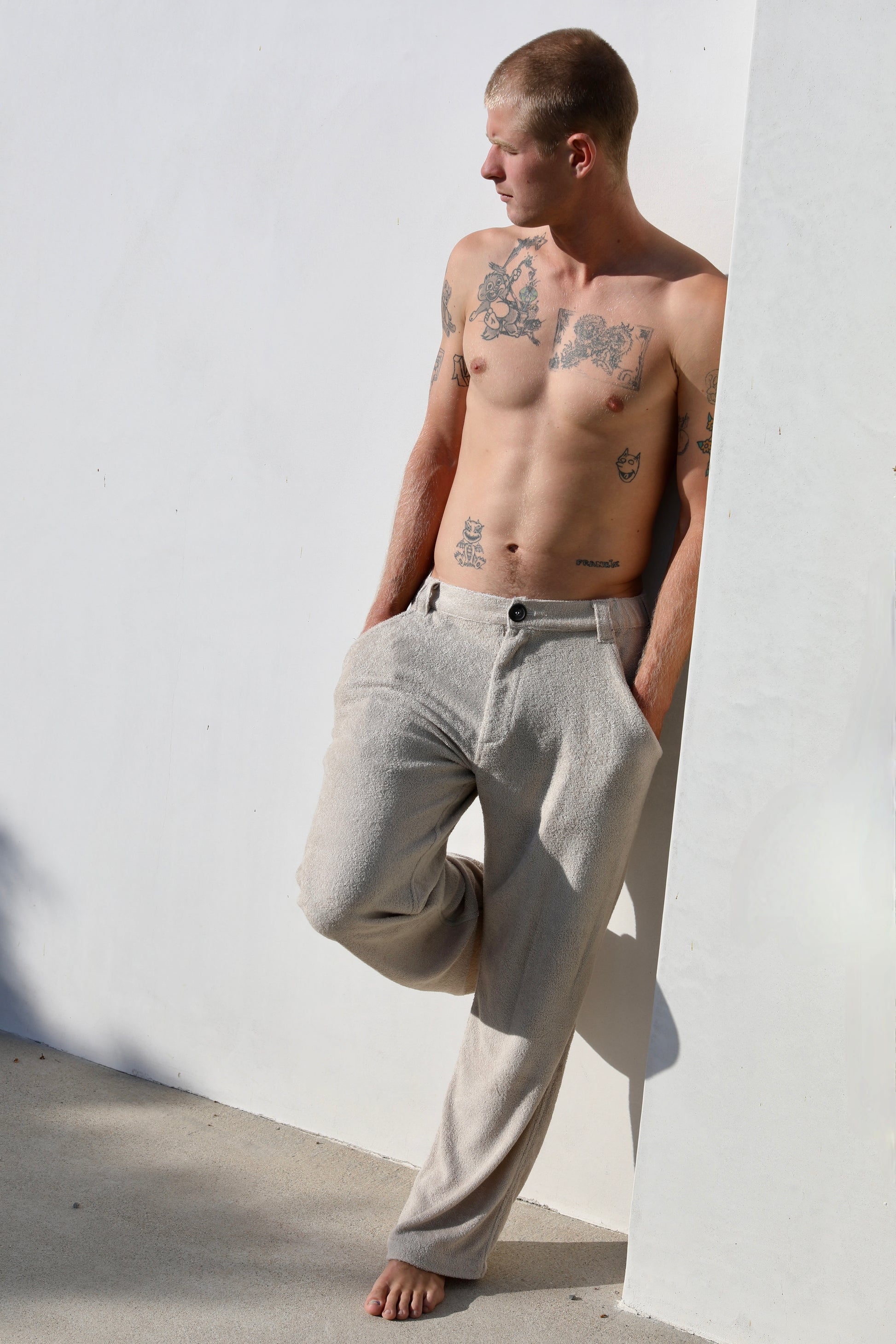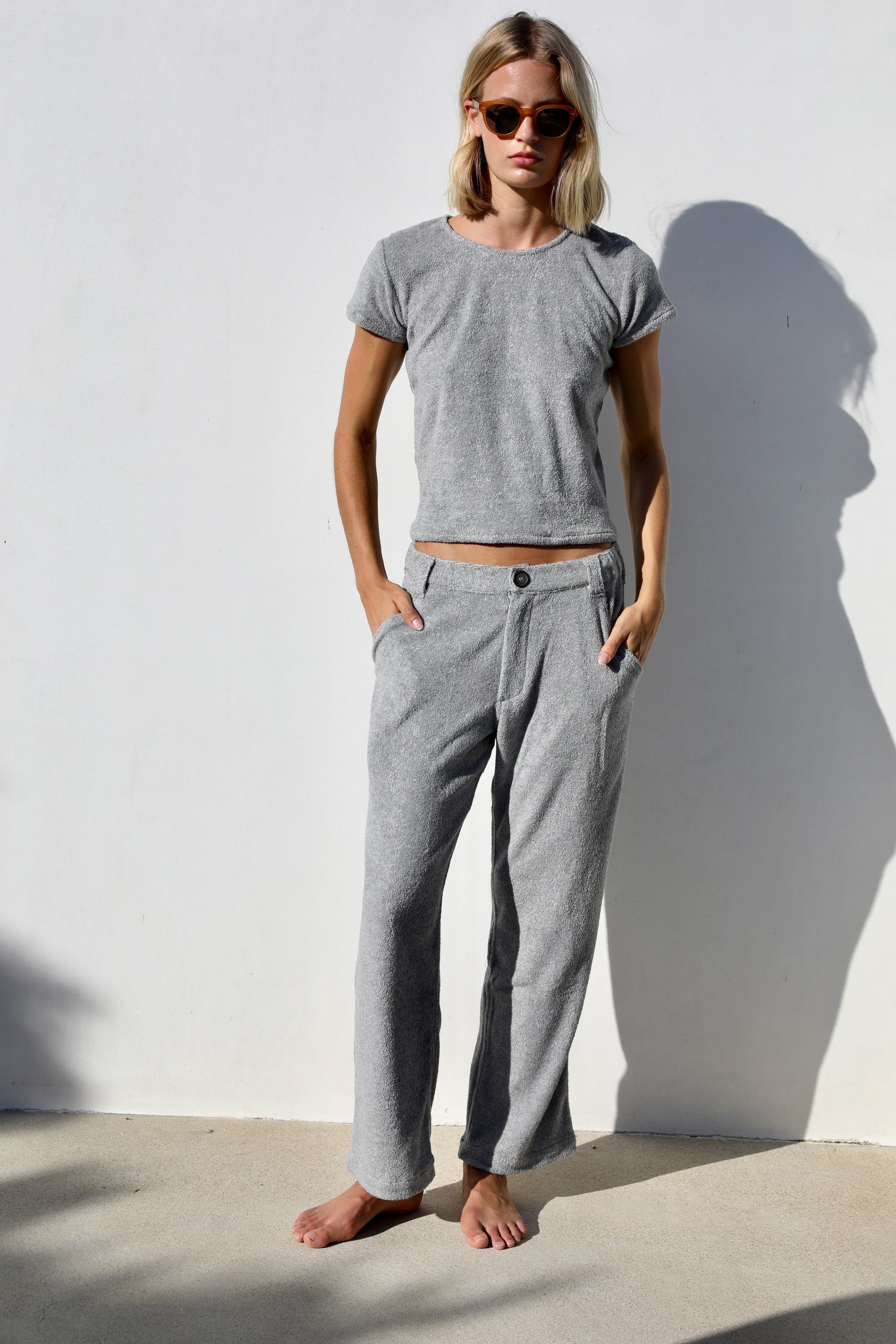 UNISEX Loose Fit Terry Pant, zipper and button closure, Belt loops, 2 side pockets and 2 large back pockets. Sits low on hip.