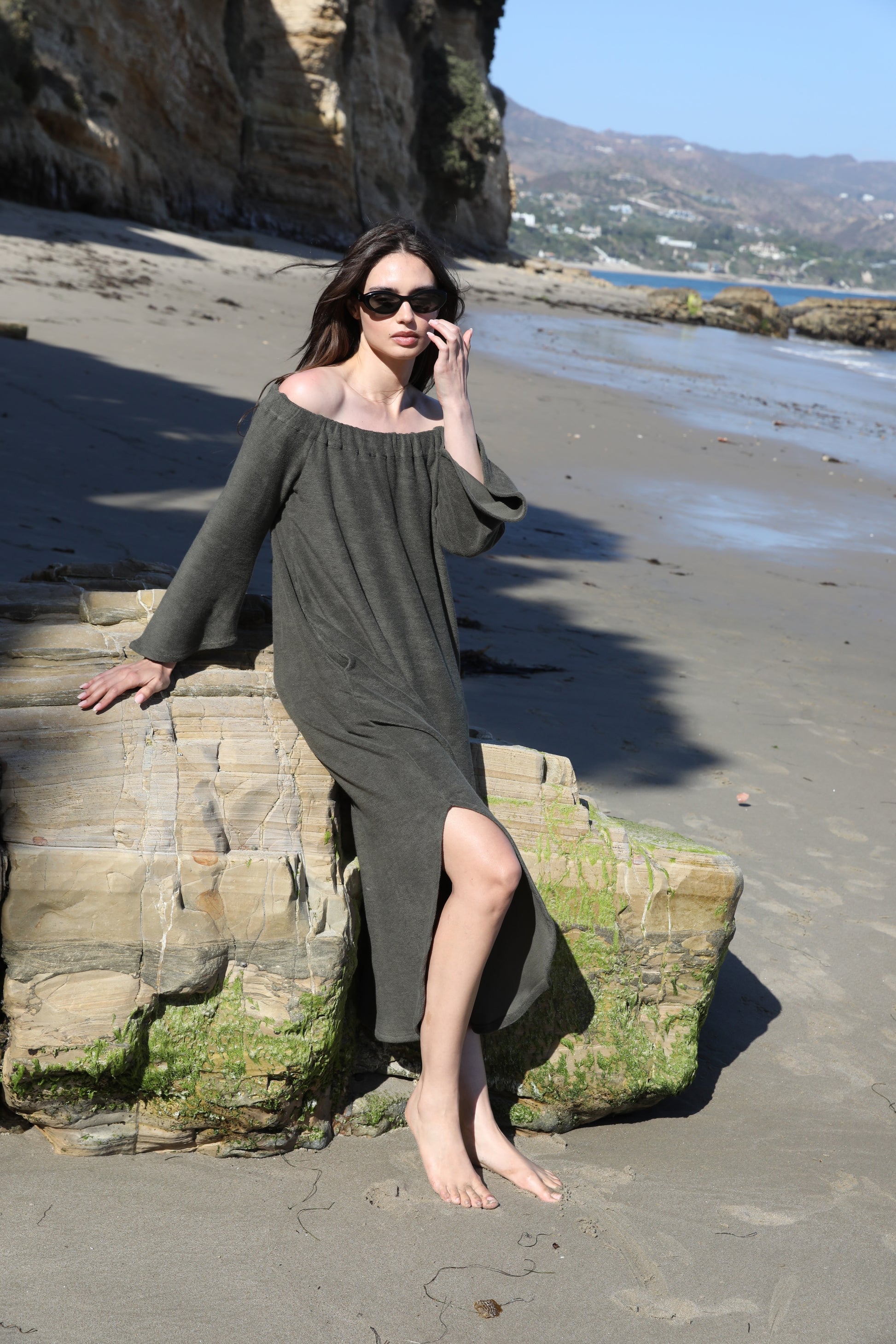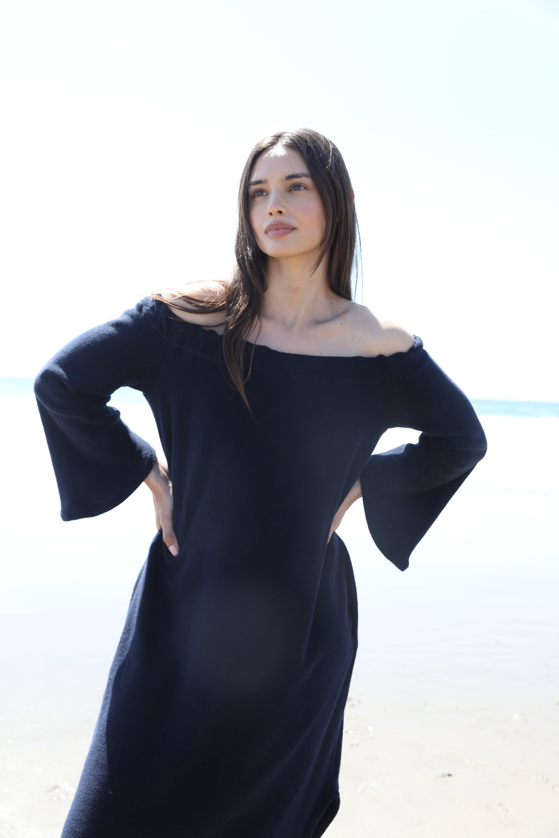 Off the Shoulder dress with Pockets in our 100% Japanese Cotton . Thinner shaved Terry.