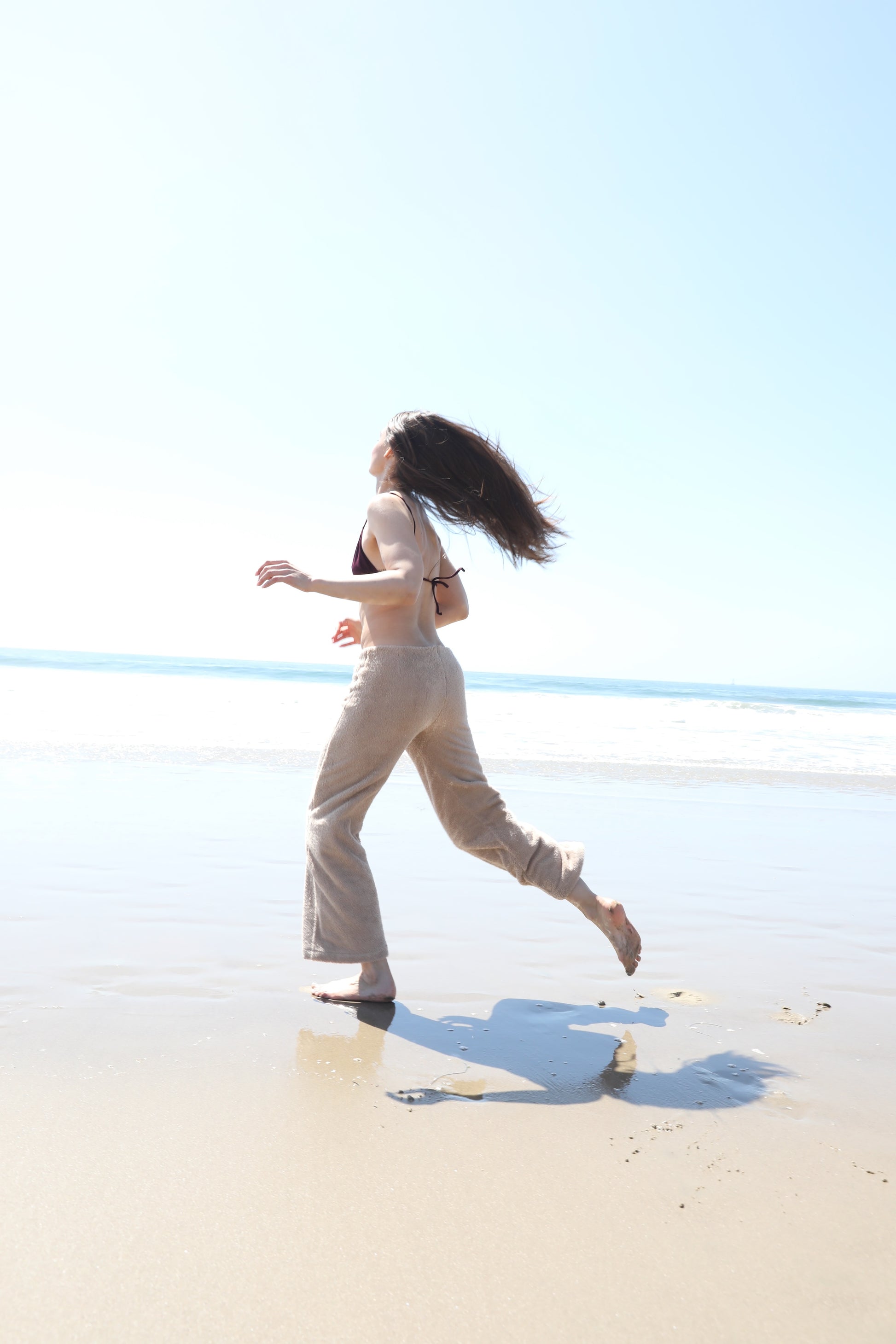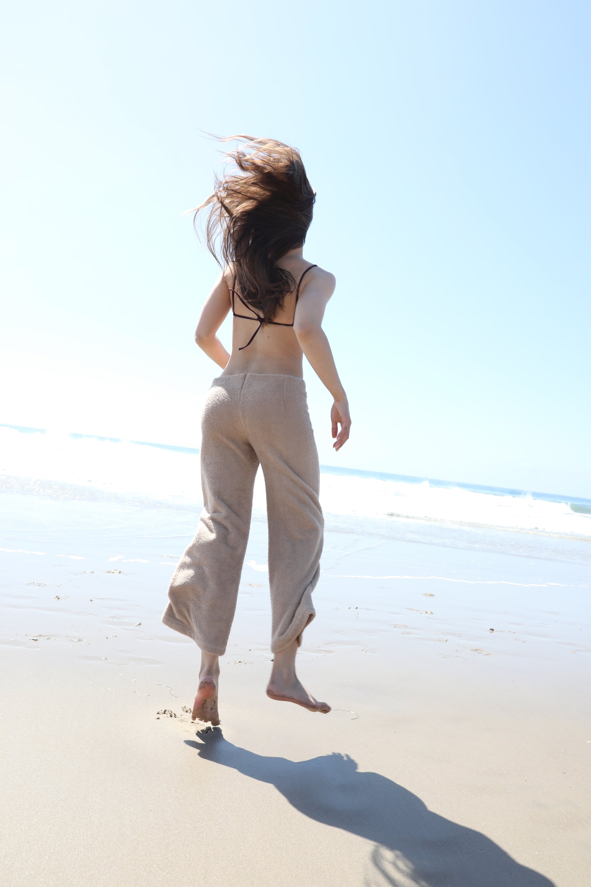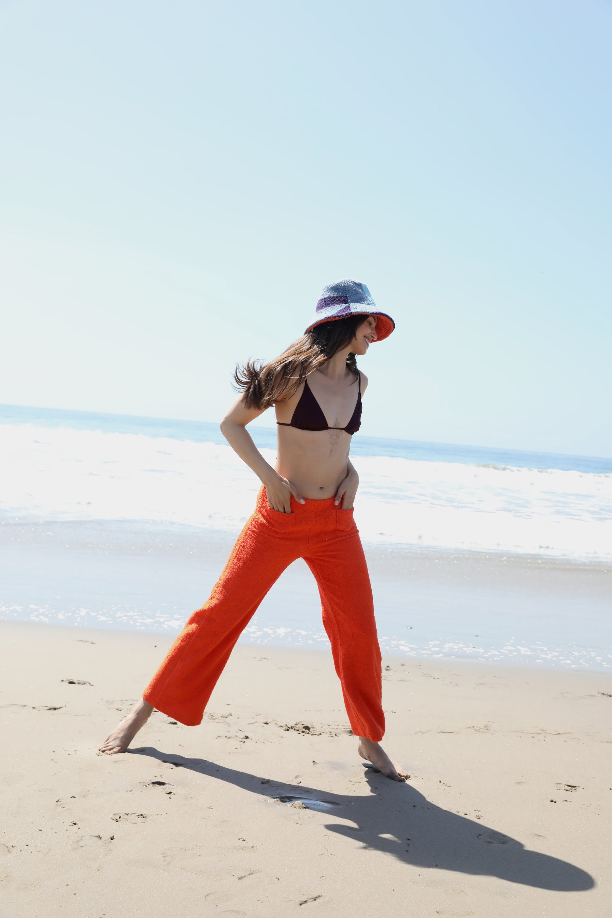 Pant with an invisible back Zipper and two front pockets. Sits below waist. Model wears size small