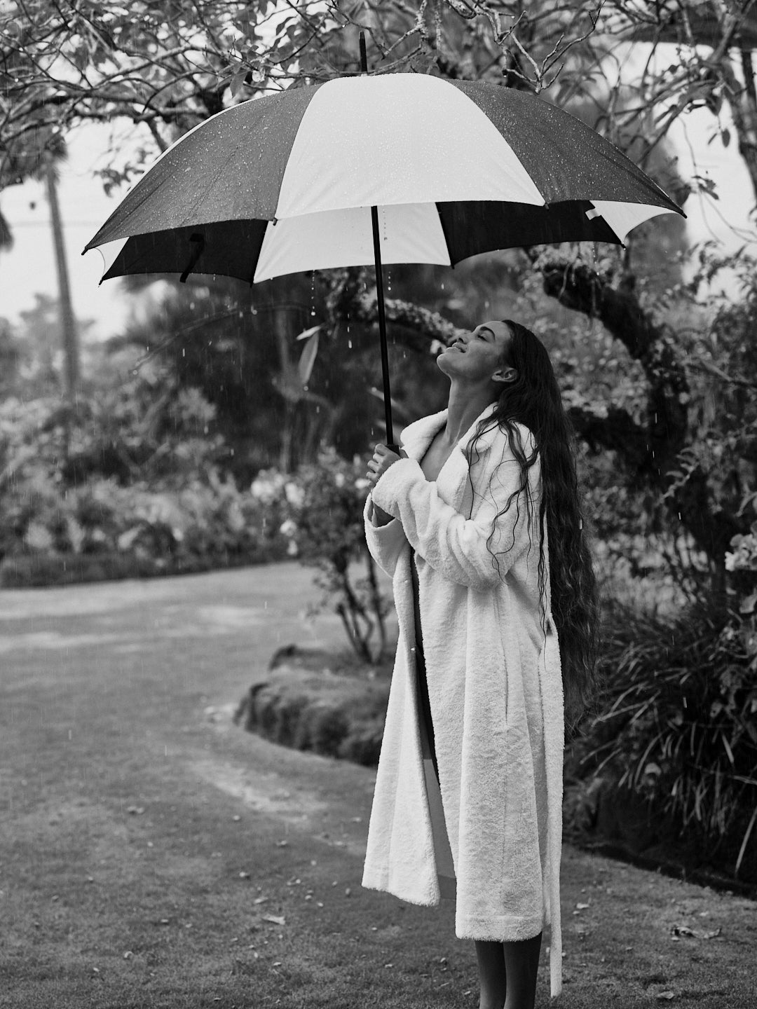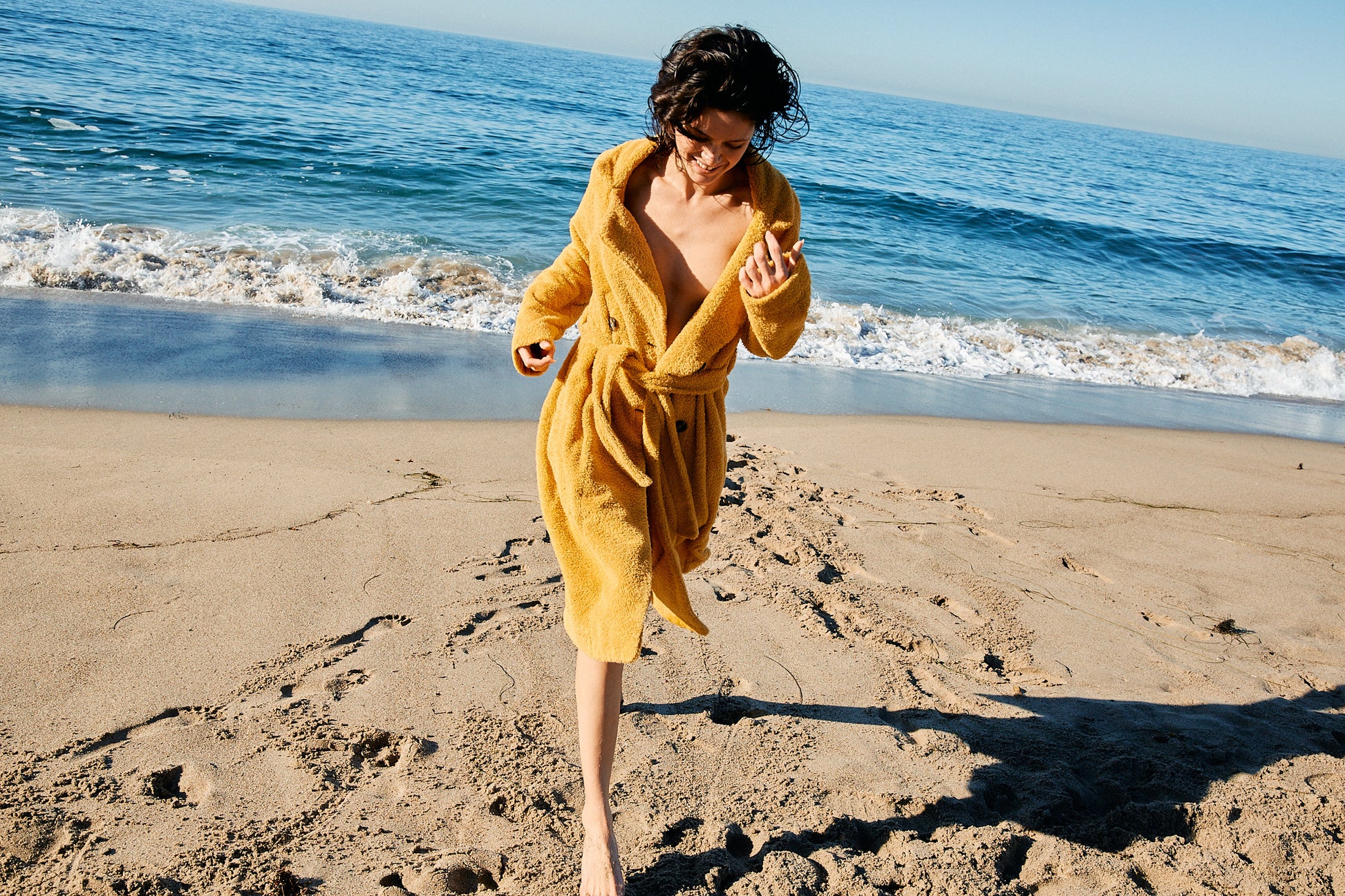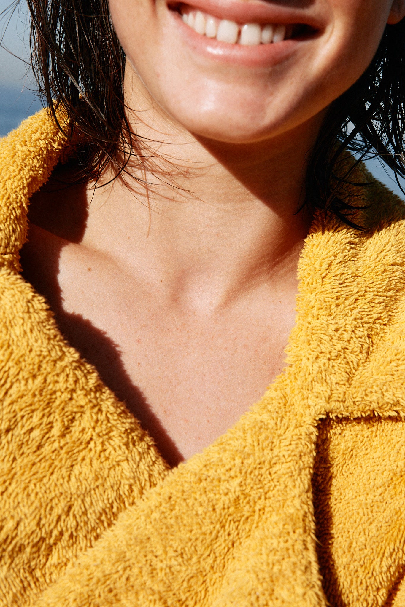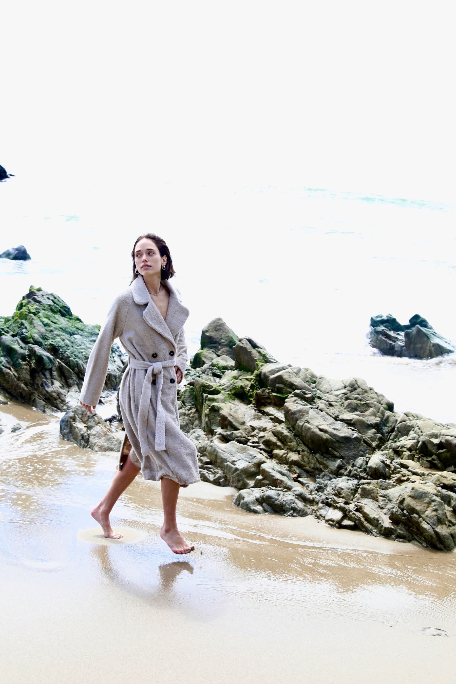 UNISEX Double Breasted Coat in plush Terry. Wide collar and two in seam side pockets. 4 large horn effect buttons and matching belt.