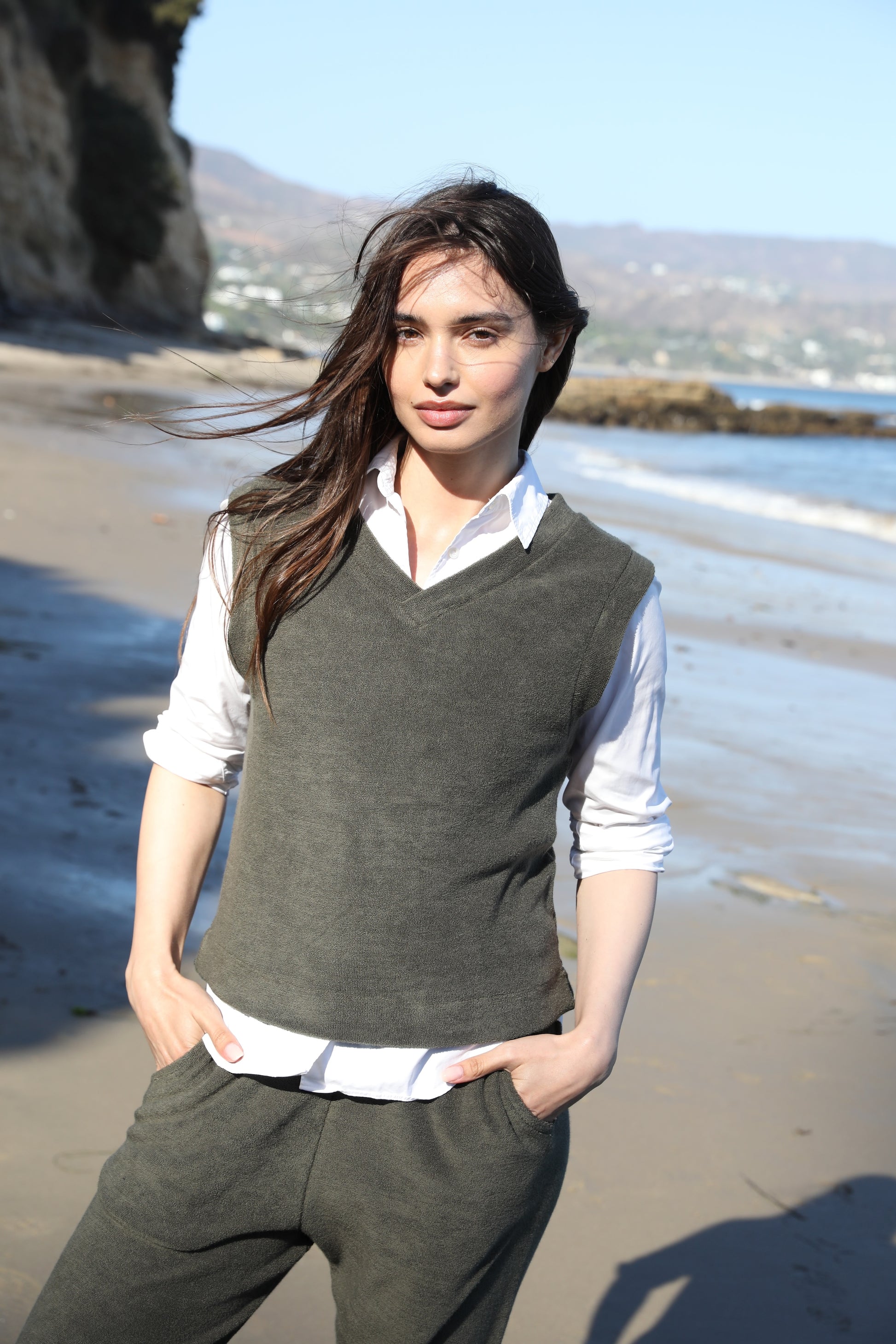V neck sleeveless t-shirt. 100% Japanese Terry. Model wears size S